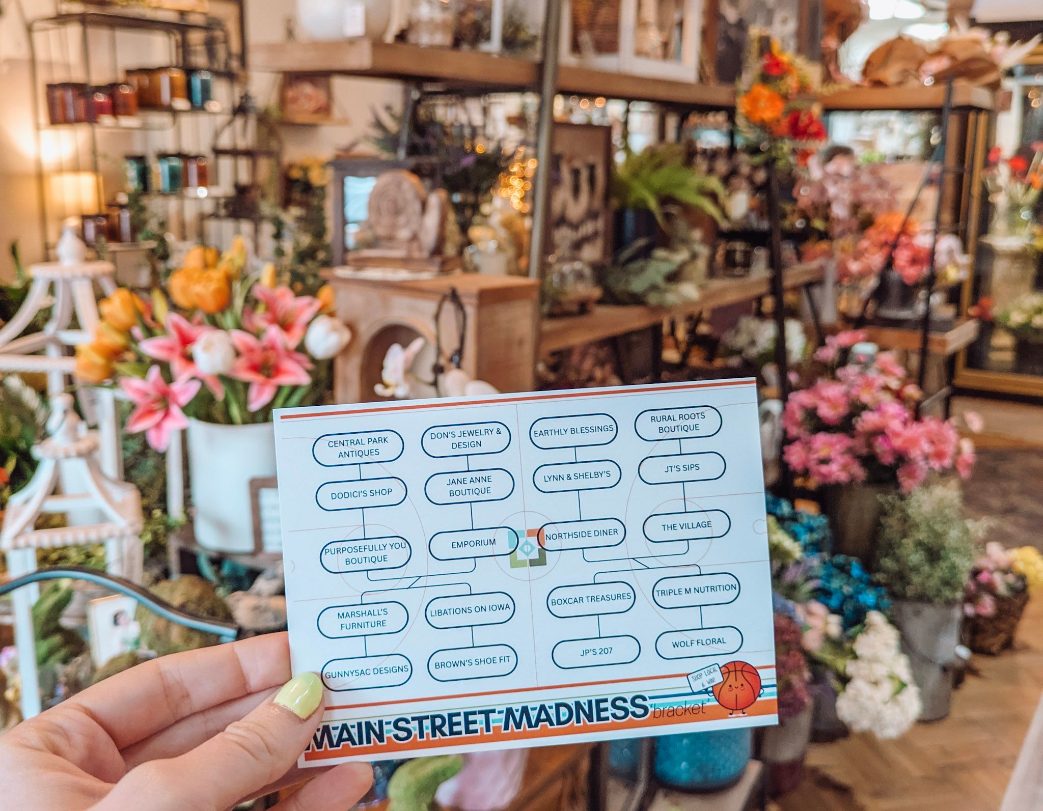 Shop, Eat, or Drink: Visit the businesses listed on the bracket.