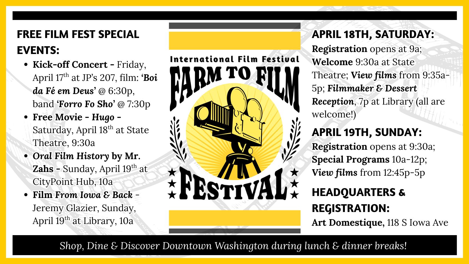 Don’t miss this FREE weekend packed full of entertainment! Start it on Friday night at JP’s with a free film & concert and keep going through the whole weekend. Explore downtown while you’re here, shop, eat & fall in love with our history!